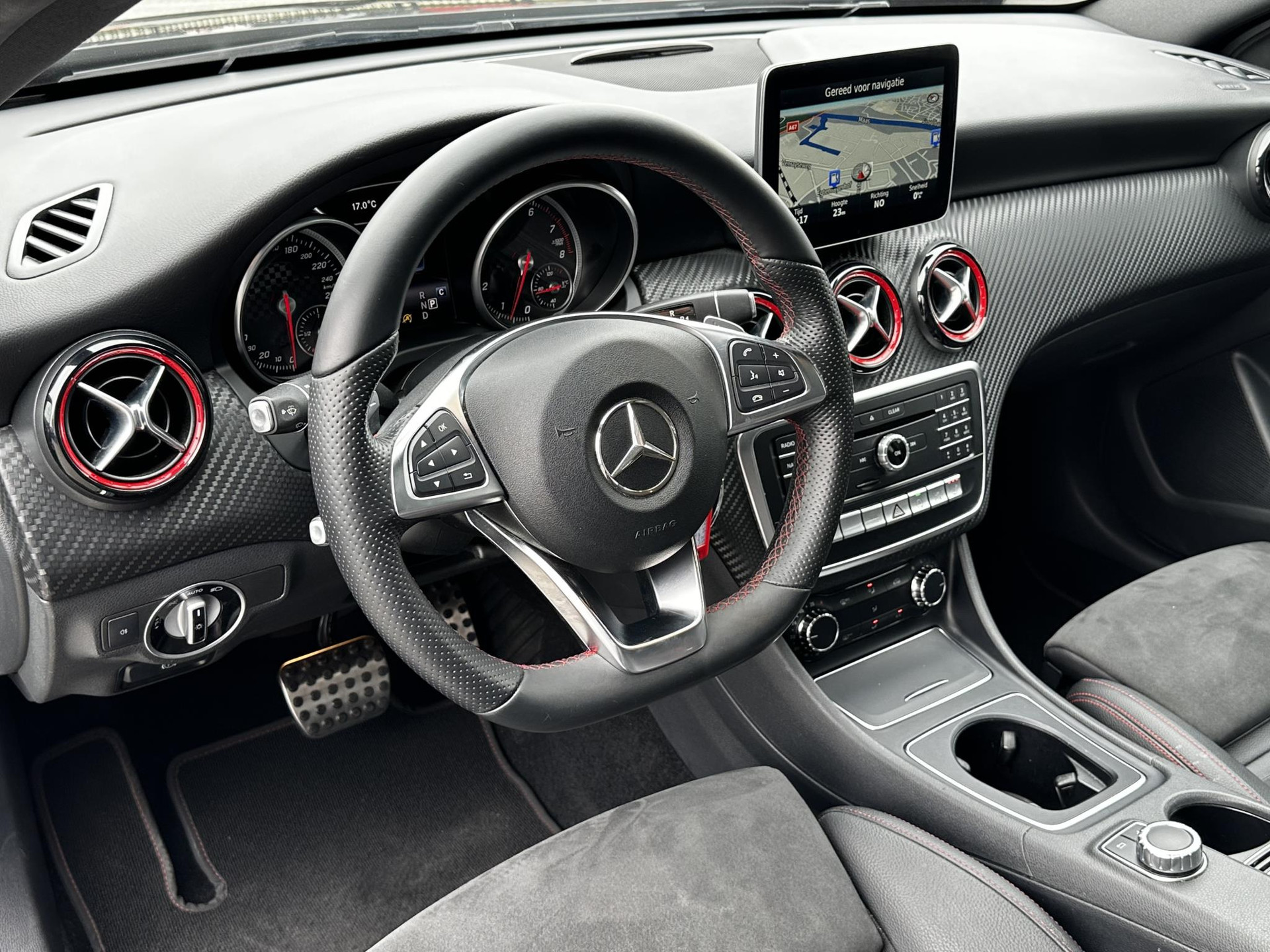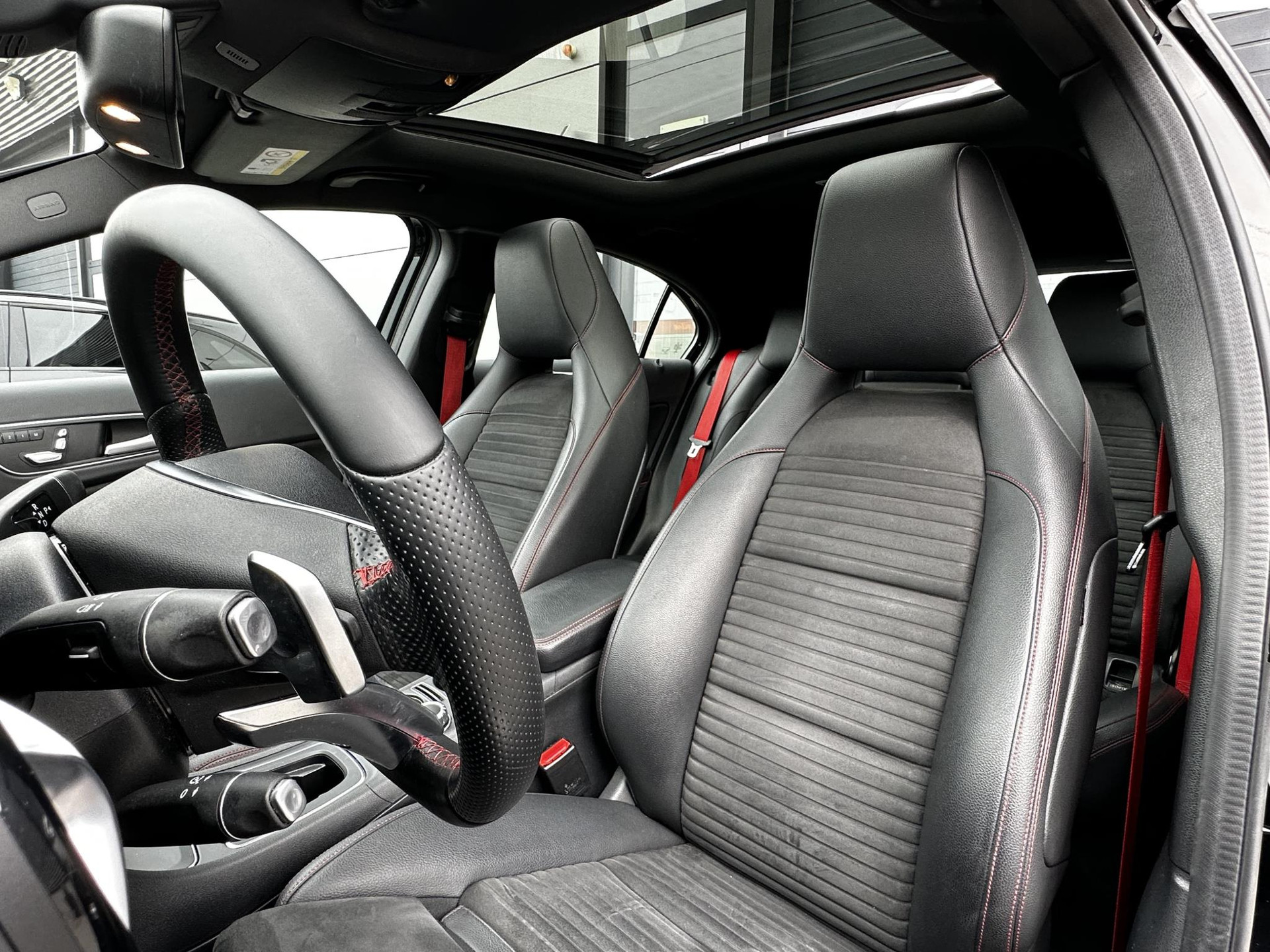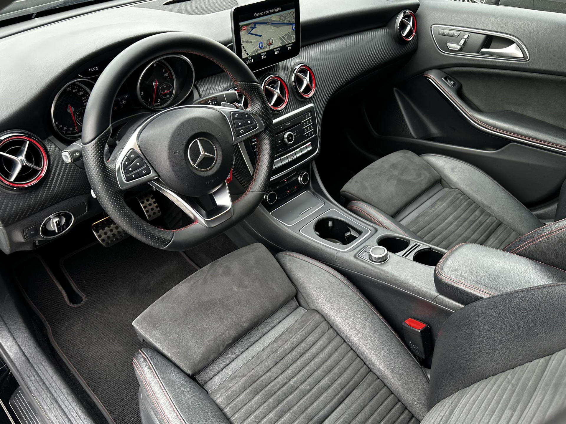De volledige optielijst van de auto ziet er als volgt uit: 218 Achteruitrijcamera 234 Dodehoekassistent 235 Actieve parkeerassistent 242 Bestuurdersstoel rechts elektrisch verstelbaar met memory 249 Binnen- en buitenspiegel automatisch dimmend 275 Memorypakket (bestuurdersstoel, stuurkolom en spiegel) 345 Regensensor 351 Ecall-noodoproepsysteem 357 SD-kaartnavigatie 400 Armsteun achter 413 Panoramaschuifdak 428 Stuurschakeltoetsen/stuurschakelpaddles - gespoten 429 7-traps automatische transmissie met dubbele koppeling 440 Tempomat 442 Multifunctioneel stuurwiel (12 toetsen) 475 Bandenspanningscontrole (RDK) 486 Sportonderstel 4U7 Zekering tegen spanningsdaling start-stopsysteem 500 Buitenspiegels elektrisch inklapbaar 51U Interieurhemelbekleding stof zwart 580 Airco 632 Koplampen led statisch rechtsrijdend verkeer 772 AMG-styling - frontspoiler, dorpelverbreders 774 18 inch-5-spaaks AMG-velgen rondom 810 Sound system Premium HarmanKardon 818 Single cd-speler 857 Centraal display 873 Stoelverwarming voor bestuurder en bijrijder 875 Ruitersproeierinstallatie, verwarmd 877 Sfeerverlichting 950 AMG-line B03 Directe start/ECO start-stopsysteem B59 Keuzeschakelaar rijprogramma (Agility Select) P49 Spiegelpakket P84 Sport Edition U22 Lendensteunverstelling voor U25 Instaplijsten verlicht U59 Zitcomfortpakket