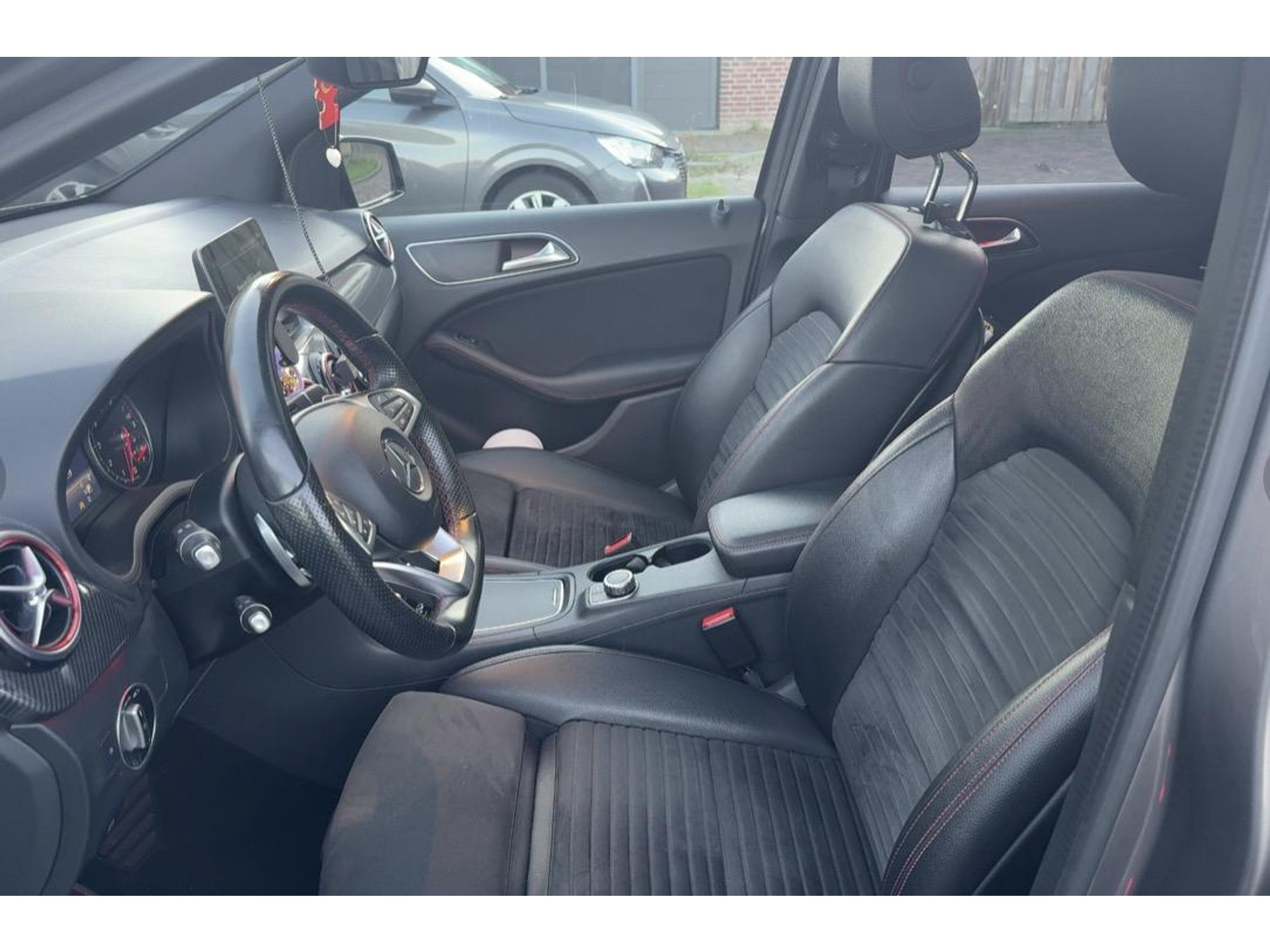 De volledige optielijst van de auto ziet er als volgt uit: peling 235 Actieve parkeerassistent 258 Botsingswaarschuwing met actieve remingreep FCW-stop 280 Stuurwiel en versnellingshendel met leder bekleed 310 Dubbele bekerhouder 345 Regensensor 357 SD-kaartnavigatie 367 Voorbereiding Live Traffic Information 413 Panoramaschuifdak 428 Stuurschakeltoetsen/stuurschakelpaddles - gespoten 429 7-traps automatische transmissie met dubbele koppeling 440 Tempomat 442 Multifunctioneel stuurwiel (12 toetsen) 475 Bandenspanningscontrole (RDK) 485 Comfortonderstel 4U7 Zekering tegen spanningsdaling start-stopsysteem 51U Interieurhemelbekleding stof zwart 522 Radio AUDIO 20 geschikt voor navigatie NTG5 543 Zonneklep met extra functie 553L Nederland 580 Airco 632 Koplampen led statisch rechtsrijdend verkeer 723 Afdekking bagageruimte 772 AMG-styling - frontspoiler, dorpelverbreders 818 Single cd-speler 840 Glas donker getint 857 Centraal display maat S 873 Stoelverwarming voor bestuurder en bijrijder 877 Sfeerverlichting 893 KEYLESS START 942 Laadruimte-/bagageruimtepakket 950 AMG-line B03 Directe start/ECO start-stopsysteem B09 Aircocompressor met magneetkoppeling B51 TIREFIT B59 Keuzeschakelaar rijprogramma (Agility Select) K11 Adaptief remlicht knipperend K13 Aansturingscode voor service-interval 25000 km P55 Nightpakket R01 Zomerband U26 Vloermatten - AMG U35 12V-aansluiting in laadruimte U59 Zitcomfortpakket U62 Licht- en zichtpakket