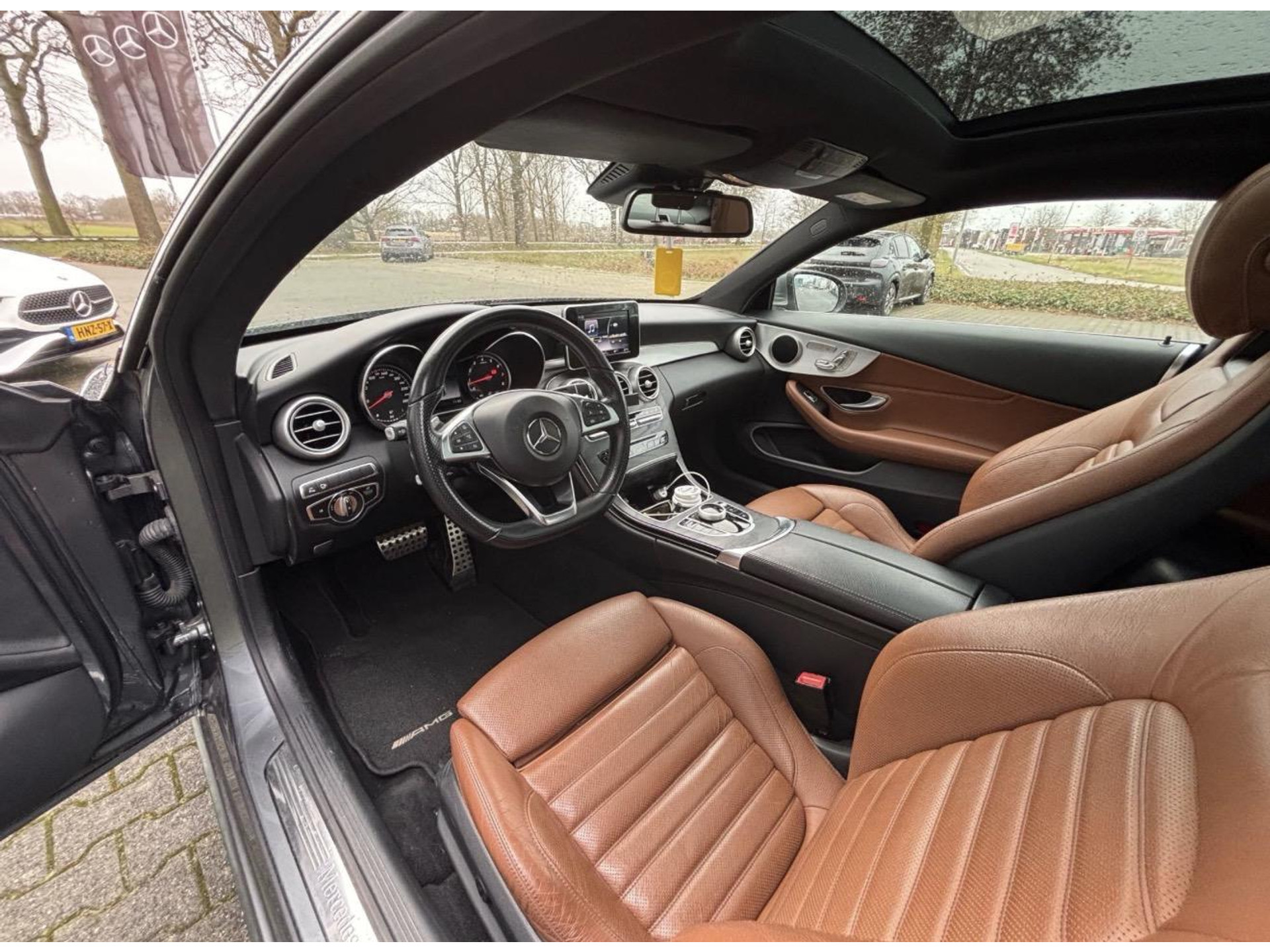 De volledige optielijst van de auto ziet er als volgt uit: 224A Leder - bruin 234 Dodehoekassistent 235 Actieve parkeerassistent 242 Bestuurdersstoel rechts elektrisch verstelbaar met memory 249 Binnen- en buitenspiegel automatisch dimmend 258 Botsingswaarschuwing met actieve remingreep FCW-stop 270 Gps-antenne 274 Telefoonantenne 275 Memorypakket (bestuurdersstoel, stuurkolom en spiegel) 287 Doorlaadmogelijkheid 309 Bekerhouder 30P Opbergvakpakket 345 Regensensor 351 Ecall-noodoproepsysteem 355 Voorbereiding voor inbouw navigatie naderhand 357 SD-kaartnavigatie 367 Voorbereiding Live Traffic Information 413 Panoramaschuifdak 421 Automatische negentraps transmissie 440 Tempomat 475 Bandenspanningscontrole (RDK) 486 Sportonderstel 500 Buitenspiegels elektrisch inklapbaar 501 360°-camera 51U Interieurhemelbekleding stof zwart 611 Omgevingsverlichting 628 Automatische in-/uitschakeling grootlicht plus (IHC+) 642 Koplampen led dynamisch rechtsrijdend verkeer 736 Sierdelen - essenhout zwart 772 AMG-styling - frontspoiler, dorpelverbreders 776 Verbrede wielkasten 788 19 inch multispaaks AMG-velgen 'achter bredere banden dan voor' 818 Single cd-speler 873 Stoelverwarming voor bestuurder en bijrijder 876 Interieurverlichtingspakket 893 KEYLESS START 916 Brandstoftank met grotere inhoud B09 Aircocompressor met magneetkoppeling B59 Keuzeschakelaar rijprogramma (Agility Select) P29 AMG Line-interieur/AMG-sportpakket interieur P31 AMG Line-exterieur/AMG-sportpakket exterieur P44 Inparkeerpakket P49 Spiegelpakket U02 Gordelaanreiker U10 Bijrijdersstoel met gewichtsherkenning U22 Lendensteunverstelling voor U26 Vloermatten - AMG